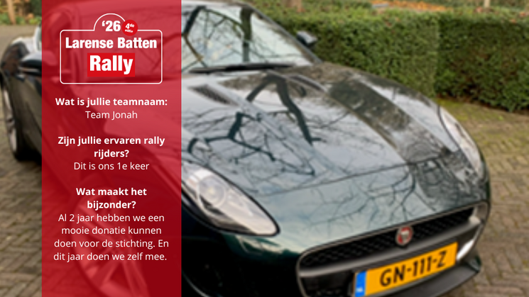 Met frisse energie, een flinke dosis enthousiasme en een prachtige Jaguar F-Type uit 2015 aan de start, maakt Team Jonah, bestaande uit Henk Oost en Gino Valkenburg, in 2026 zijn debuut in de Larense Batten Rally.