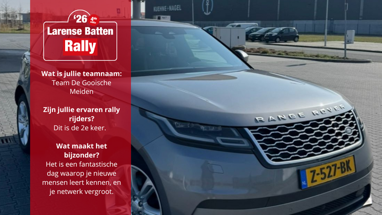De Gooische Meiden nemen deel in stijl: ze stappen in de Rage Rover Velar, bouwjaar 2022, zij zijn klaar om de uitdaging aan te gaan. Ervaring in het rallyrijden hebben ze niet, maar dat is volgens hen juist de charme van de Larense Batten Rally. "Iedereen kan meedoen, ook zonder ervaring. Dat maakt deze dag laagdrempelig, toegankelijk en bovenal ontzettend gezellig," vertellen ze enthousiast.
