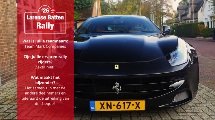 Mark en Sacha verschijnen aan de startlijn met een Ferrari FF V12 uit 2012, een auto die niet alleen kracht uitstraalt, maar ook pure passie voor het rijden. Ondanks hun indrukwekkende bolide geven zij aan geen ervaren rallyrijders te zijn. "Zeker niet!" Maar dat past precies bij de charme van de Larense Batten Rally: Iedereen doet mee op z'n eigen niveau, voor het plezier, de uitdaging en natuurlijk het goede doel.