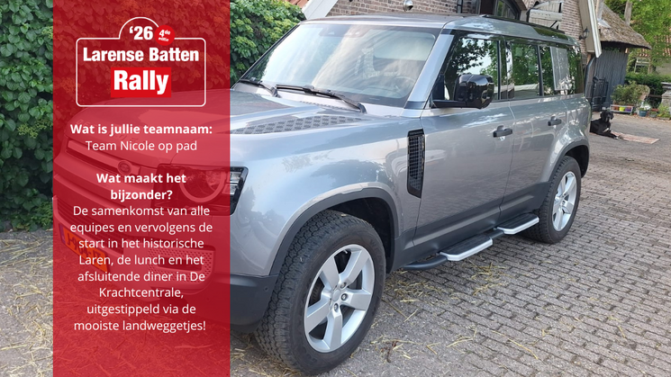 Nicole en Arne rijden in 2026 opnieuw mee met hun Landrover Defender P400. Als we vragen wat hen het meest is bijgebleven van hun vorige deelname geven zij aan: ‘De sfeer bij aankomst, alle equipes, de start in het historische Laren. De prachtige route over de mooiste (land)weggetjes, de lunch en het afsluitende diner in de Krachtcentrale, maakten de dag compleet.”