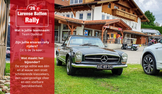 19-11-2025 | 14:01 Richard Oude Reimerink en Jasper van Balen van team Oude Bal, staan komend jaar voor de 2de keer aan de start van de Larense Batten Rally. Net als afgelopen editie rijden zij in hun stijlvolle Mercedes 230SL uit 1966, een klassieke schoonheid die elke startlijst glans geeft.Hoewel ze zichzelf niet als doorgewinterde rallyrijders bestempelen, waren Richard en Jasper tijdens hun eerste deelname direct onder de indruk.“De vorige editie was één en al wauw: een stoet schitterende klassiekers, een supergezellige sfeer en een voelbare betrokkenheid van iedereen. Je geniet volop, maar voelt tegelijkertijd waarom je rijdt. Die unieke combinatie van fun, competitie en een indrukwekkend goed doel maakt de dag echt onvergetelijk.”Voor Team Oude Bal draait de Larense Batten Rally om veel meer dan navigeren, sturen en genieten van het parcours. Het is juist de unieke mix van plezier en betekenis die deze rally voor hen zo speciaal maakt.“De rally brengt alles samen: passie voor auto’s, sportief rijden, gezelligheid en een enorm gevoel van saamhorigheid. Het is een dag waarop je geniet en tegelijkertijd heel bewust bent van waarom je rijdt.”De ontspannen sfeer, de prachtige klassieke auto’s en het gezamenlijke doel creëren een ervaring die raakt. Richard en Jasper benadrukken dat het bijzonder is om in zo’n prettige setting aandacht te vragen voor een levensbeperkende ziekte als de ziekte van Batten.Iedere deelnemer lijkt gedreven om er niet alleen een mooie dag van te maken, maar ook om samen écht impact te maken. Dat maakt de rally voor hen veel meer dan zomaar een toertocht:“Het is echt een evenement met hart.”Schrijf je in en rijd mee of doe een donatie aan team Oude Bal
