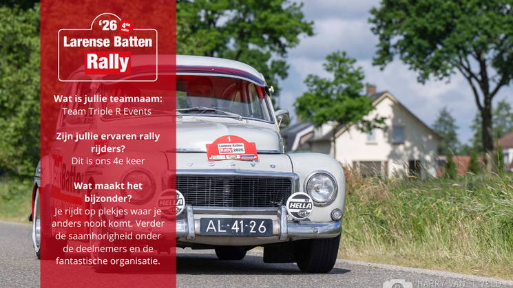 Op 23 mei staan de broers Eric en Rob Hurink opnieuw aan de start van de Larense Batten Rally. Onder de naam Team Triple R Events maken zij zich op voor hun 4de deelname aan dit inmiddels vertrouwde en geliefde evenement.