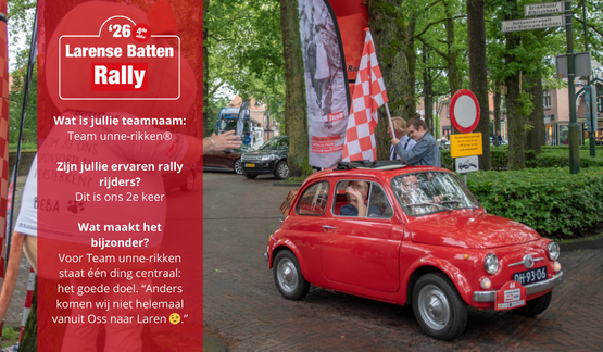 14-11-2025 | 13:42 Dit jaar staan Bas Rikken en Birgit van den Hogen van Team unne-rikken® Design op Maat voor de 2de keer aan de start van de Larense Batten Rally. Zij zijn via de Wolf Rally Oss met Beat Batten in aanraking gekomen. Vanuit Oss reizen zij met veel plezier af naar Laren – en dat… doen ze niet zomaar. In hun charmante Fiat 500 uit 1966 gaan ze opnieuw het avontuur van de Larense Batten Rally aan.Bas en Birgit zijn geen onbekenden met goede doelen rally’s / toer ritten. “Wij proberen ieder jaar de Larense Batten Rally te rijden,” vertellen ze. Daarnaast zijn ze actief lid van ‘Oldtimer Vrienden Wijchen’, waarmee ze zo’n 13 evenementen per jaar bijwonen. Hun Fiat 500, een echte blikvanger uit de jaren 60, past perfect bij hun liefde voor klassiekers, bijzondere ritten en dit goede doel.Voor Bas en Birgit zijn de perfecte organisatie én het doel ‘Beat Batten’ waar het om draait. “Alles is super geregeld én er wordt geld ingezameld voor de kinderen met Batten.” Een dag met plezier én betekenis.Voor Team unne-rikken® Design op maat staat één ding centraal: het goede doel. “Anders komen wij niet helemaal vanuit Oss naar Laren 😉."